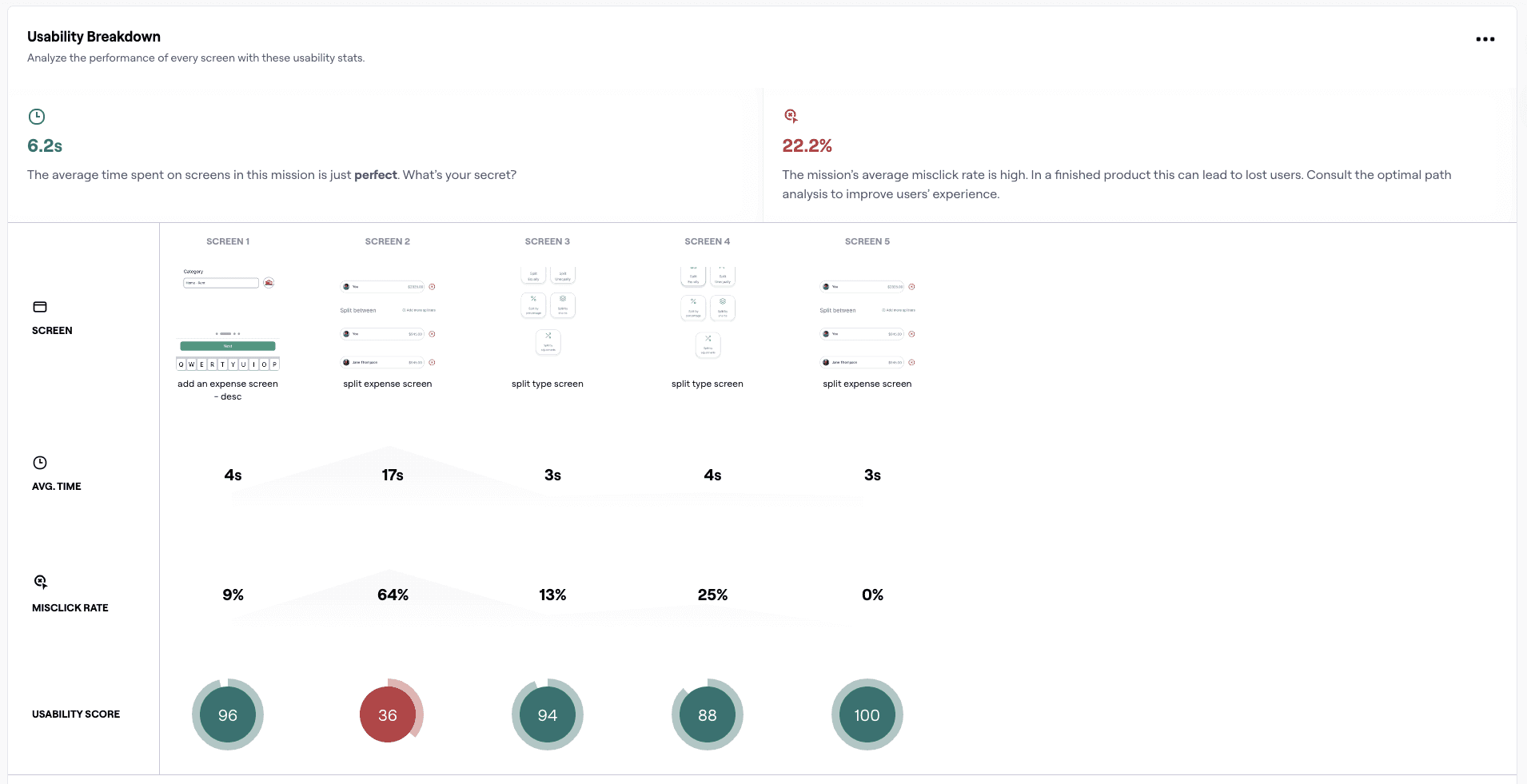 The highest misclick rate occurred on the initial “Add Expense” screen, indicating that users struggled to identify the primary action. Strengthening CTA prominence can significantly reduce confusion at the start of the flow.Immediate feedback after selection improves user confidence